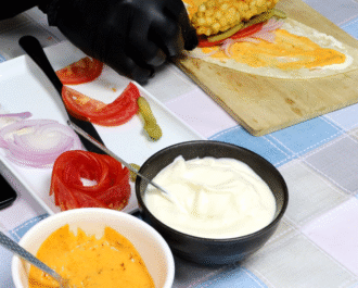 Looking for a fun, flavorful snack that’s easy to make at home? This Korean Corn Dog Wrap is a quick and delicious way to enjoy a popular street food with a fresh twist. Using our Golden Fresh Cheesy Chicken Corn Dogs, you’ll get that crispy, golden coating and gooey cheese center that makes every bite satisfying. Instead of serving them on a stick, wrap them in our soft American Mark Tortilla Wraps with some juicy tomatoes, tangy gherkins, crunchy onions, and a drizzle of your favorite sauces for an extra kick.