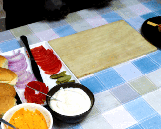 While the corn dogs cook, slice the tomatoes, gherkins and onions, and shred the lettuce (if using any). Set aside in small bowls for easy assembly later.